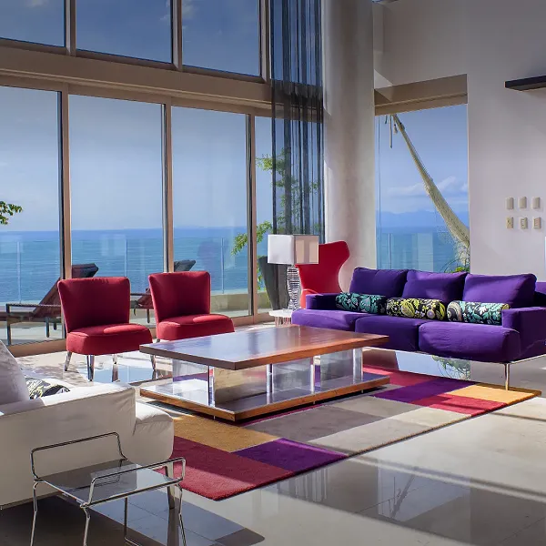 Going above and beyond, this penthouse features floor-to-ceiling sliding glass doors that seamlessly merge the indoors with the out and bring curated clean light to every room. Contemplate the stunning scenery and be transfixed by the ocean on your expansive wraparound terrace with lounge furniture, an oversized hammock, and outdoor jacuzzi. Banderas Bay looks particularly enchanting in the moonlight enhanced by the twinkling city lights.
